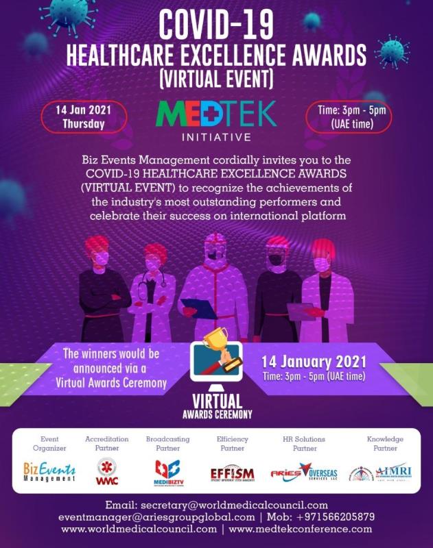World Medical Council (WMC) in association with Biz Events Management, organised the Covid-19 Healthcare Excellence Awards 2021 virtually in Dubai on January 14, 2021.