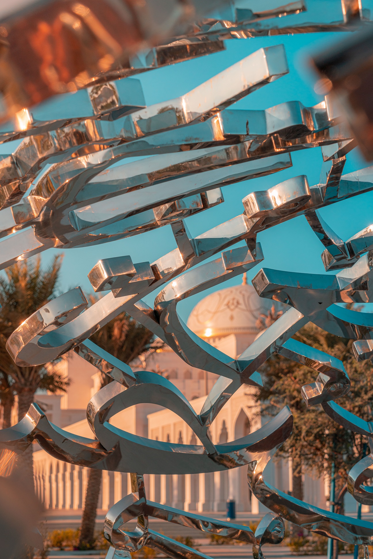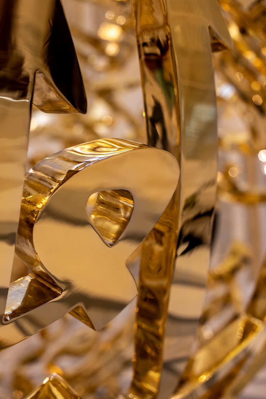 In addition to the spectacular piece of art which sits inside Qasr Al Watan, sunlight can be seen glinting off the reflective surfaces of two silver sculptures located in the garden, representing two more of the late Sheikh Zayed bin Sultan Al Nahyan’s quotes. The two sculptures are smaller versions of the Power of Words sculpture housed within the halls of the Palace.