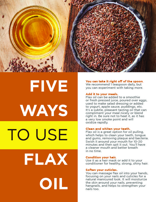 Much like flax seeds, flaxseed oil is loaded with heart-healthy omega-3 fatty acids. Omega-3 fatty acids are essential to health and have been associated with benefits like reduced inflammation, improved heart health and protection for the brain against aging and can reduce inflammation.