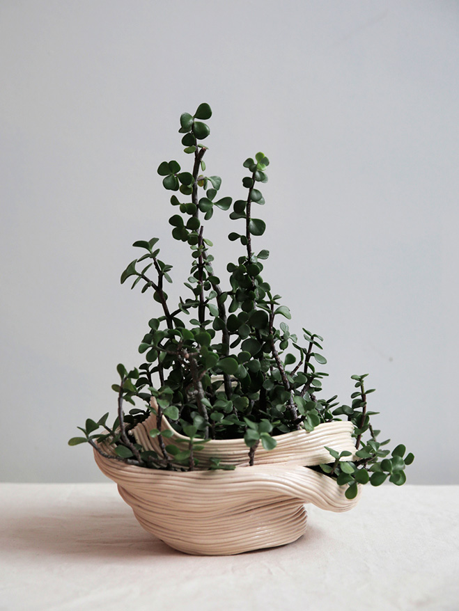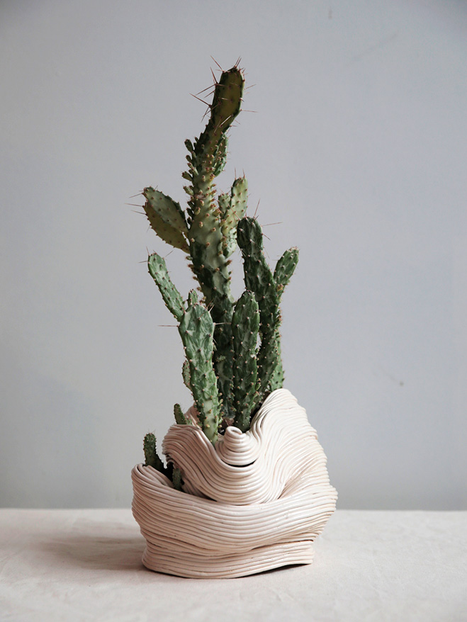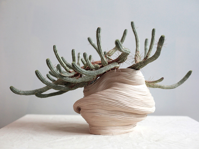 Artist Zhu Ohmu created a ceramic series of Botanical Life. Ohmu wanted to imitate the way in which they are coiled by a machine but using the human hand instead. It’s great how the plants have been integrated in to the vessels, almost becoming one with vessel itself.