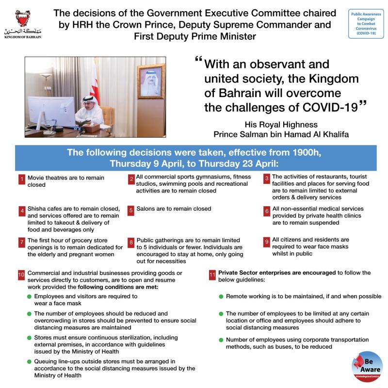 He reminded every resident and citizen of their shared responsibility – as Team Bahrain – to contribute towards national efforts to tackle the crisis.