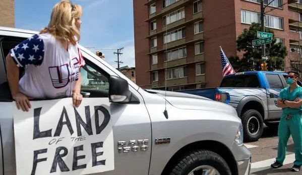 These entitled dissenters are protesting the lockdown because, quite simply, they believe it is their constitutional right to infect everyone else. One woman in Denver, Colorado screamed at a health worker from her $30,000 RAM 1500, while carrying a ‘Land of the Free’ poster: “You go to work. Why can’t I go to work?” The woman shouted: “I’ve saved people’s lives too!” I sincerely doubt that.