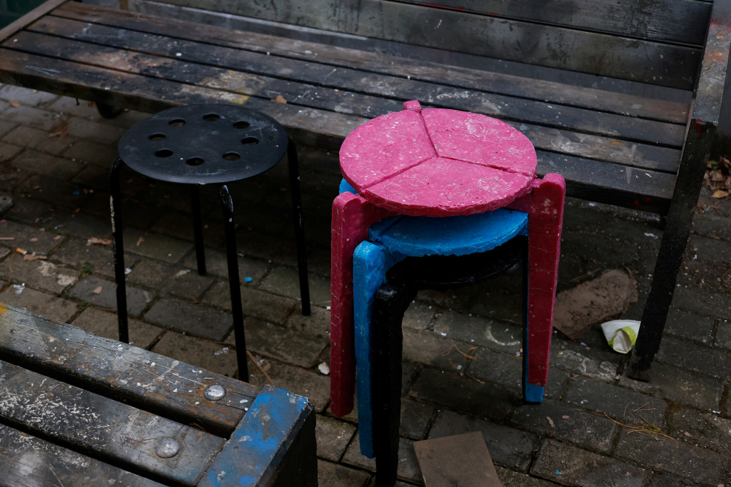 The result? Three-legged stools 45cm (18 inches) recycled from white, pink, blue and black masks, which Kim displayed in his graduation exhibition.