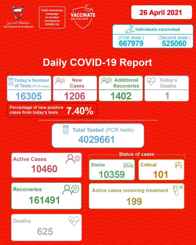 Bahrain yesterday registered 1,206 new Covid-19 cases alongside 1,402 recoveries and one fatality.