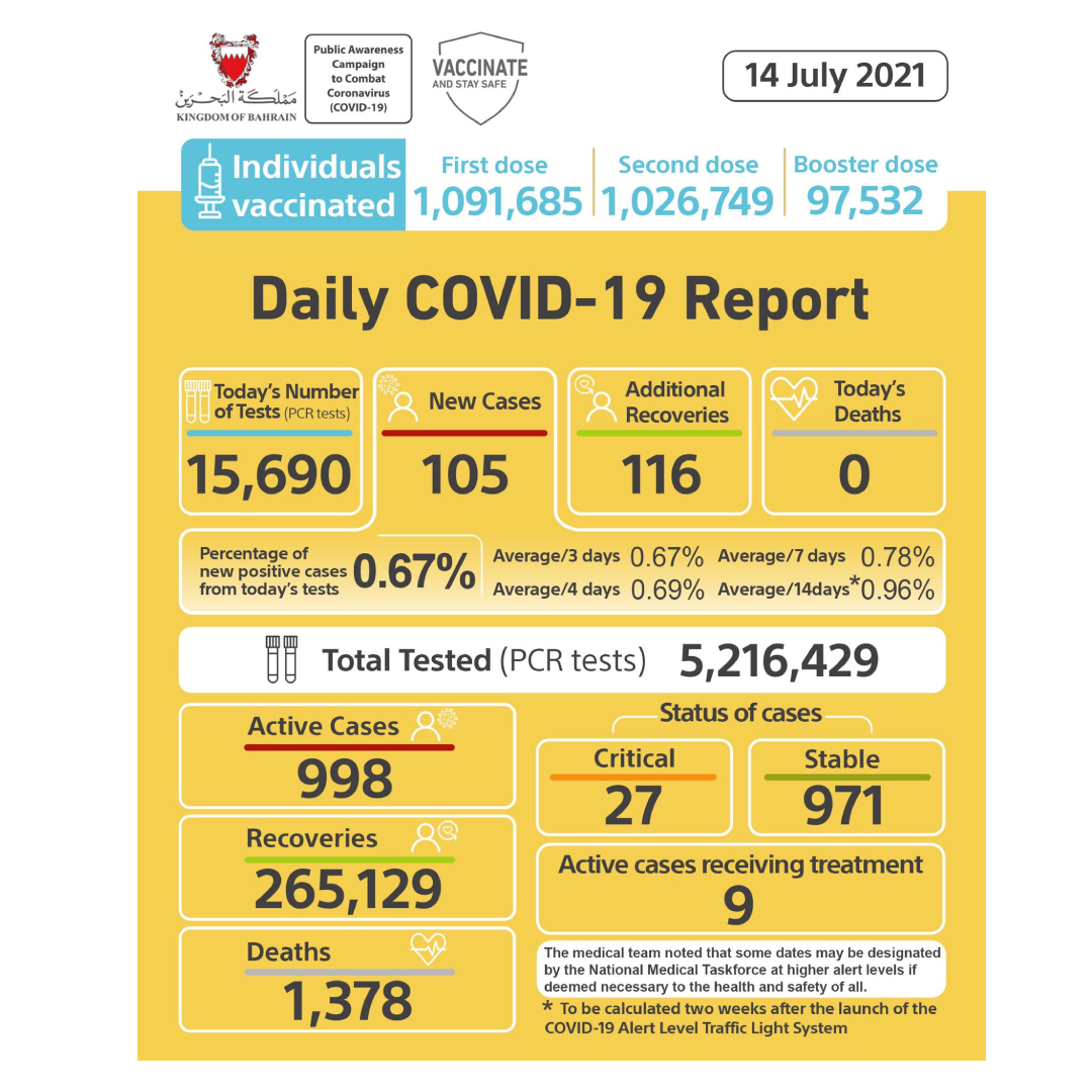 Bahrain yesterday recorded 105 new Covid-19 cases alongside 116 recoveries and no fatalities.