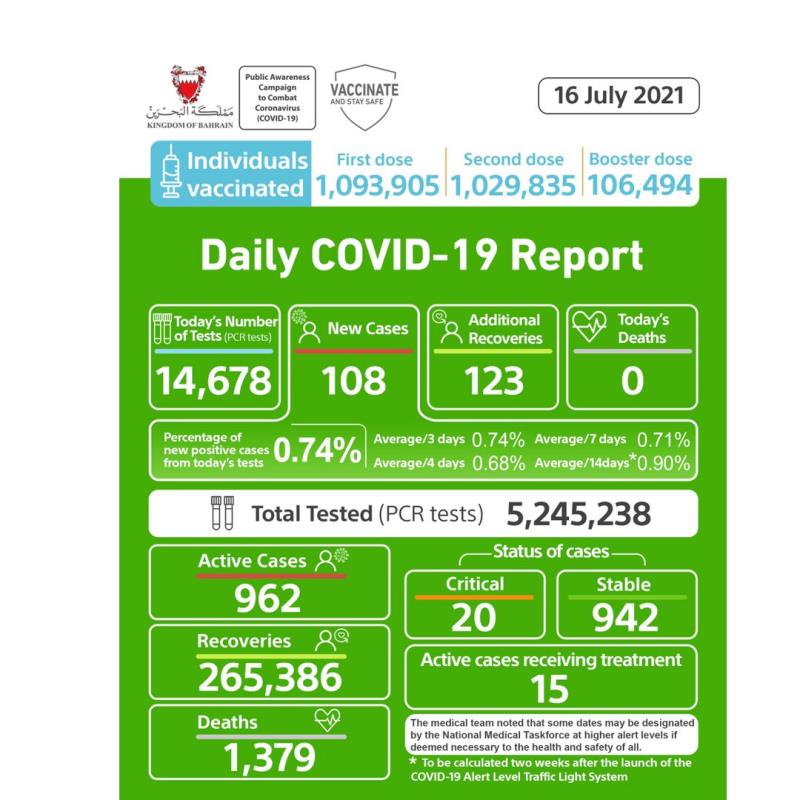 Bahrain yesterday recorded 108 new Covid-19 cases alongside 123 recoveries and no fatalities.