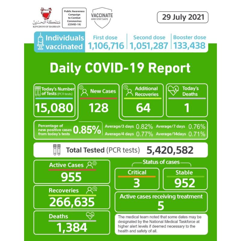 Bahrain yesterday recorded 128 new Covid-19 cases alongside 64 recoveries and one fatality.
