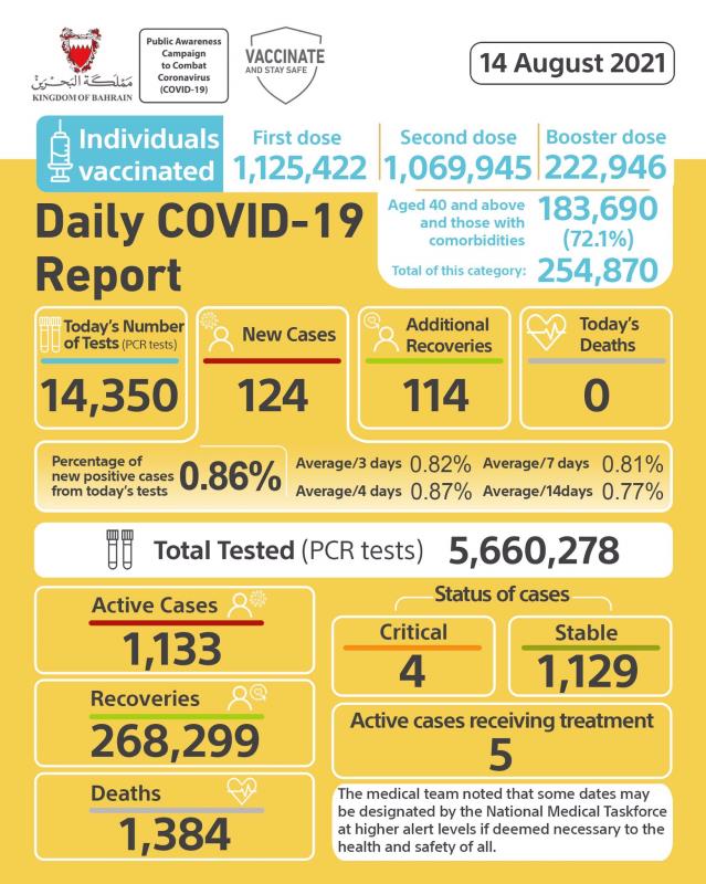 Bahrain yesterday recorded 124 new Covid-19 cases alongside 114 recoveries and no fatalities.
