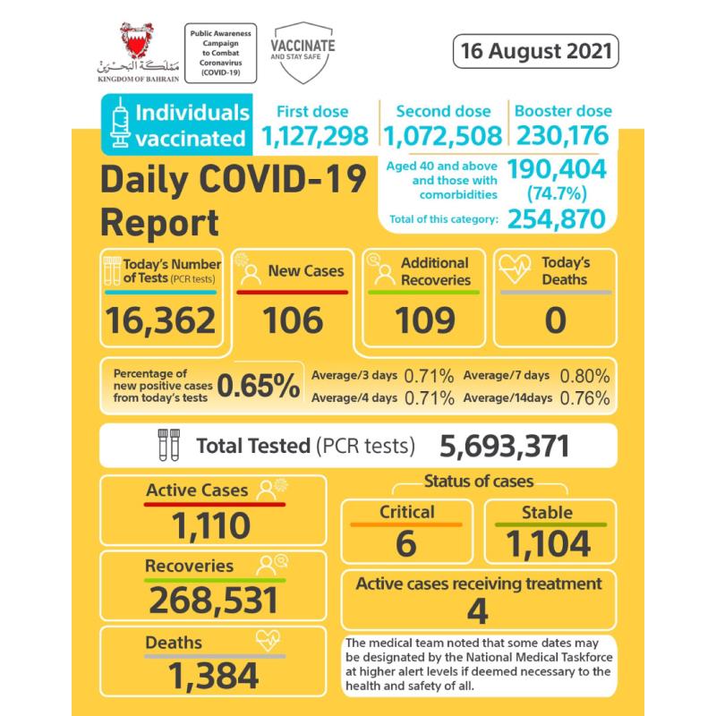 Bahrain yesterday recorded 106 new Covid-19 cases alongside 109 recoveries and no fatalities.