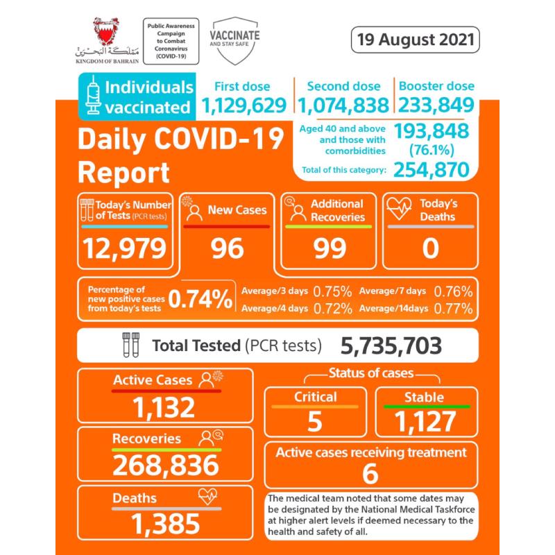 Bahrain yesterday recorded 96 new Covid-19 cases alongside 99 recoveries and no fatalities.