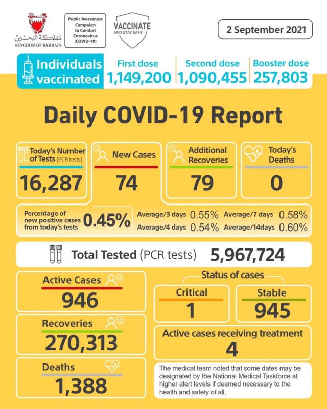 Bahrain yesterday recorded 74 new Covid-19 cases alongside 79 recoveries and no fatalities.