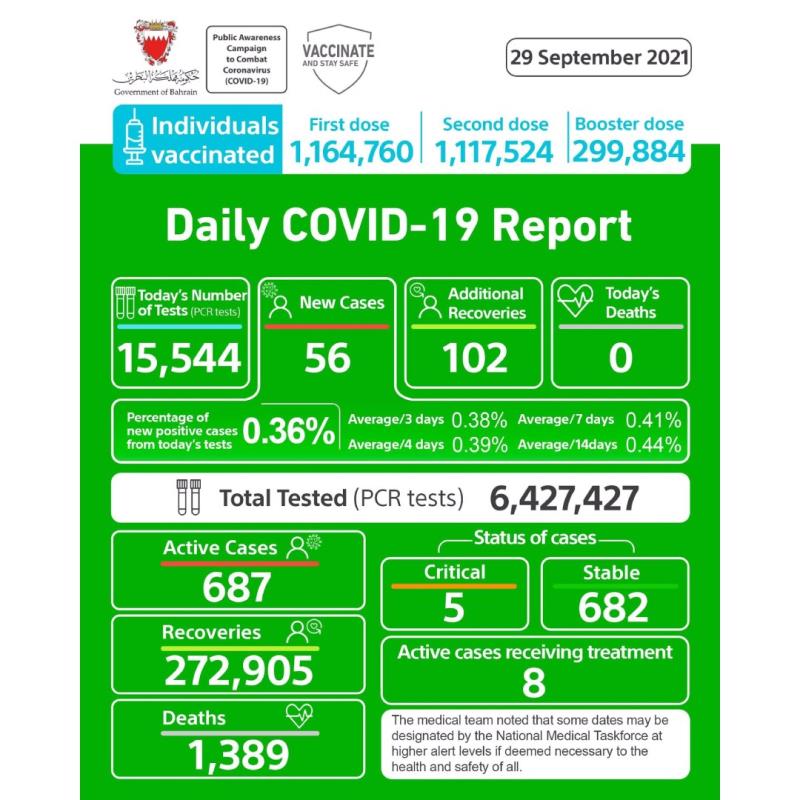 Bahrain yesterday recorded 56 new Covid-19 cases alongside 102 recoveries and no fatalities.
