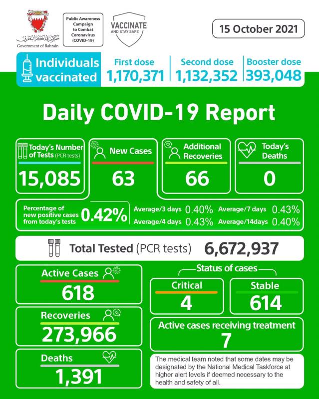 Bahrain yesterday recorded 63 new Covid-19 cases and 66 recoveries.