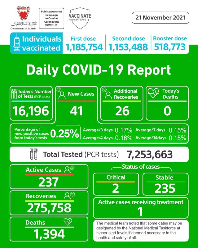 Bahrain yesterday recorded 41 new Covid-19 cases and 26 recoveries, reports GDNOnline.