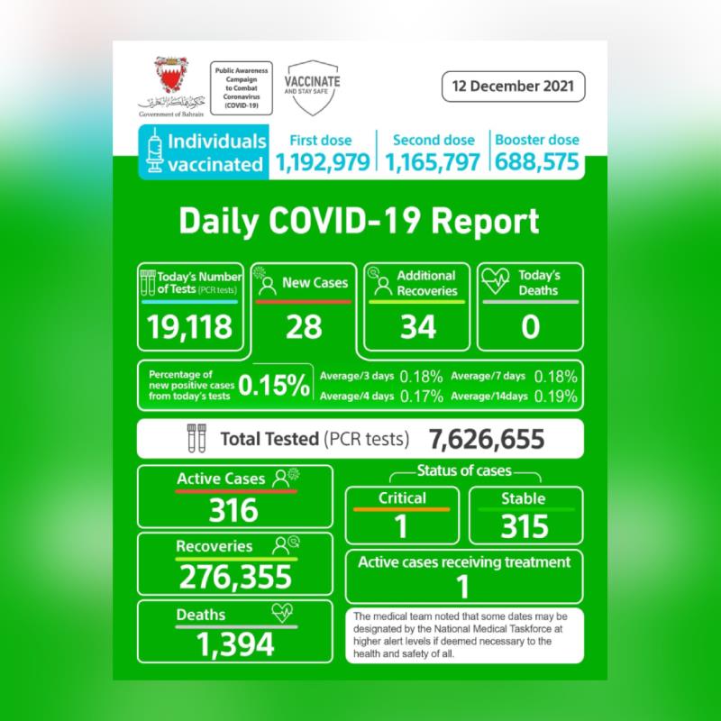 Bahrain yesterday recorded 28 new Covid-19 cases and 34 recoveries.