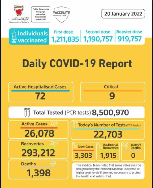 Bahrain yesterday recorded 3,303 new Covid-19 cases and 1,915 recoveries, the Health Ministry said yesterday.