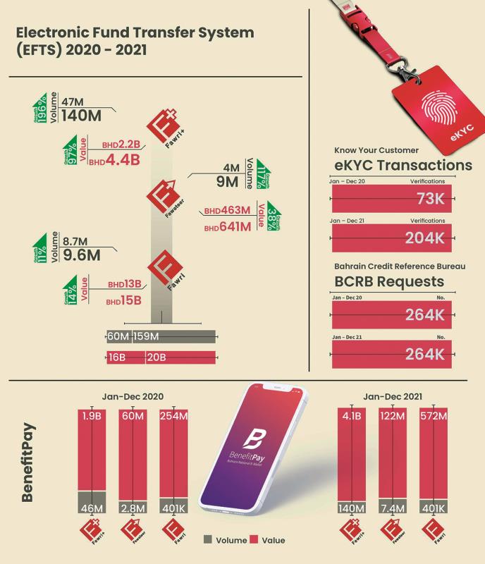 Transactions using the Fawri+ service, which allows individuals or entities to transfer funds of up to BD1,000 per day in less than 30 seconds, totalled 140,580,028 over all channels, increasing by 196pc YoY and exceeded BD4.4 billion in total value in 2021 compared with BD2.2bn in 2020, which is an increase of 97pc.