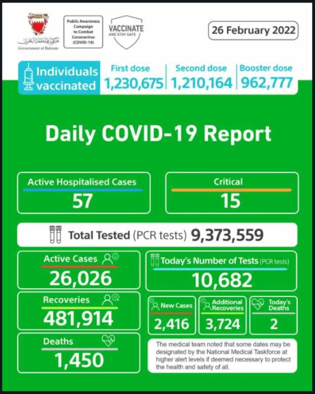 Bahrain yesterday recorded 2,416 new cases, 3,724 recoveries and two deaths.
