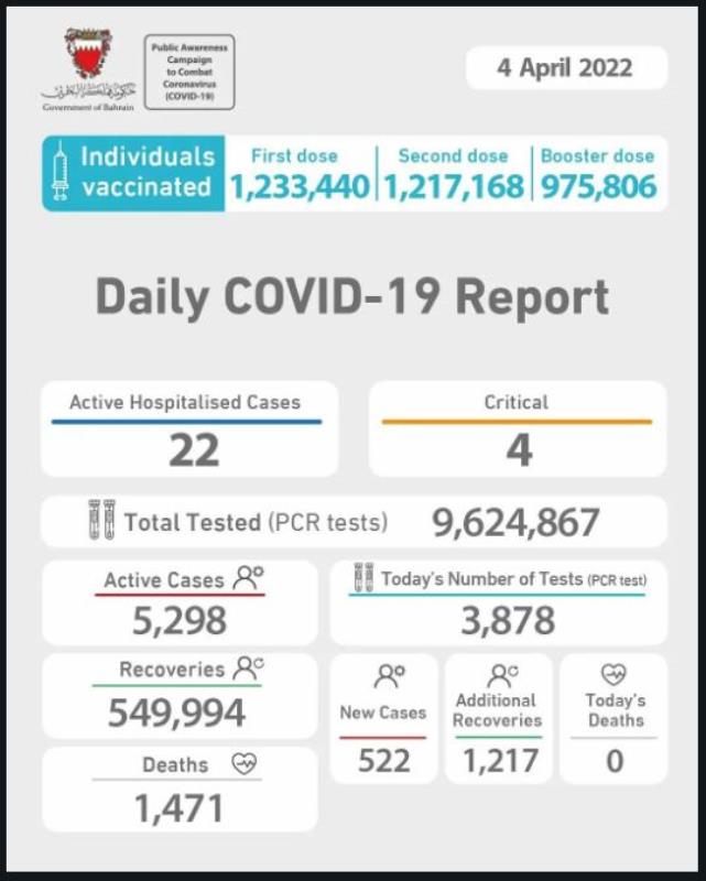 Bahrain has so far registered a total of 556,763 cases and conducted 9,624,867 tests.