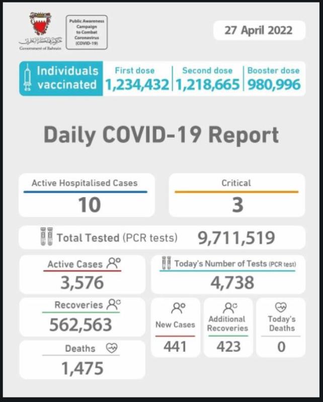 Bahrain yesterday recorded 441 new Covid cases and 423 recoveries.