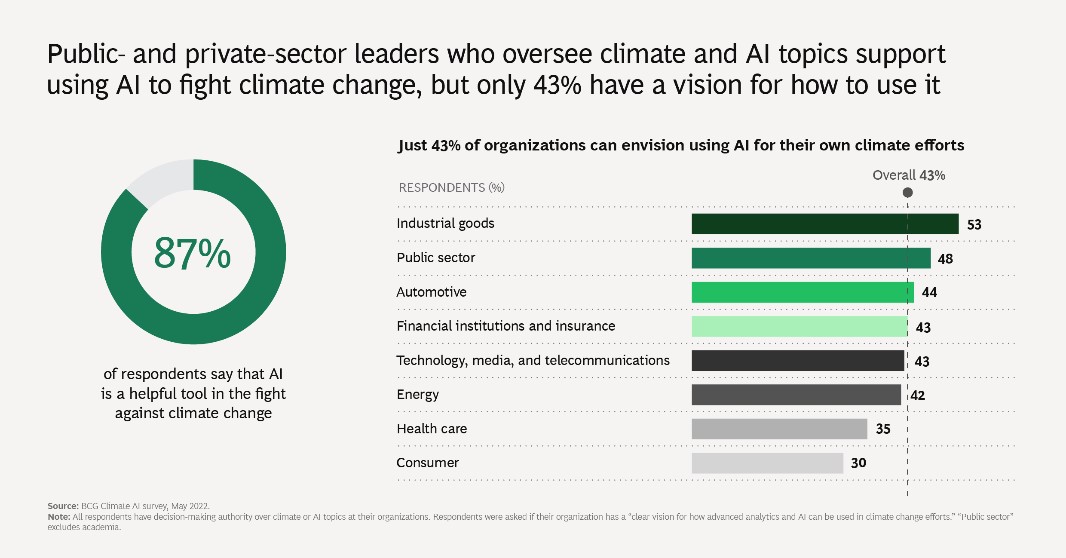 - Mitigation. One of the most critical uses of AI is in the measurement, reduction, and removal of emissions and greenhouse gas (GHG) effects. More than 60% of public- and private-sector leaders see the greatest business value for their organizations in the reduction and measurement of emissions. According to BCG, use of AI can drive reductions of 5% to 10% GHG emissions, or 2.6 to 5.3 gigatons of CO2e if applied globally.
