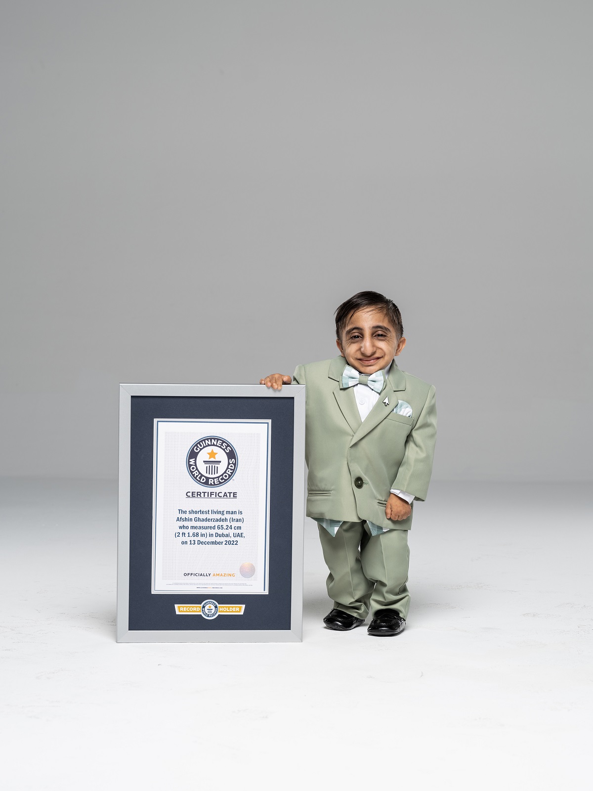 GUINNESS WORLD RECORDS™, the global authority on record-breaking, can today announce that 20-year-old Afshin Esmaeil Ghaderzadeh is the new Shortest man as verified on Tuesday, 13 December 2022, with a height of 65.24 cm (2 ft 1.68 in).