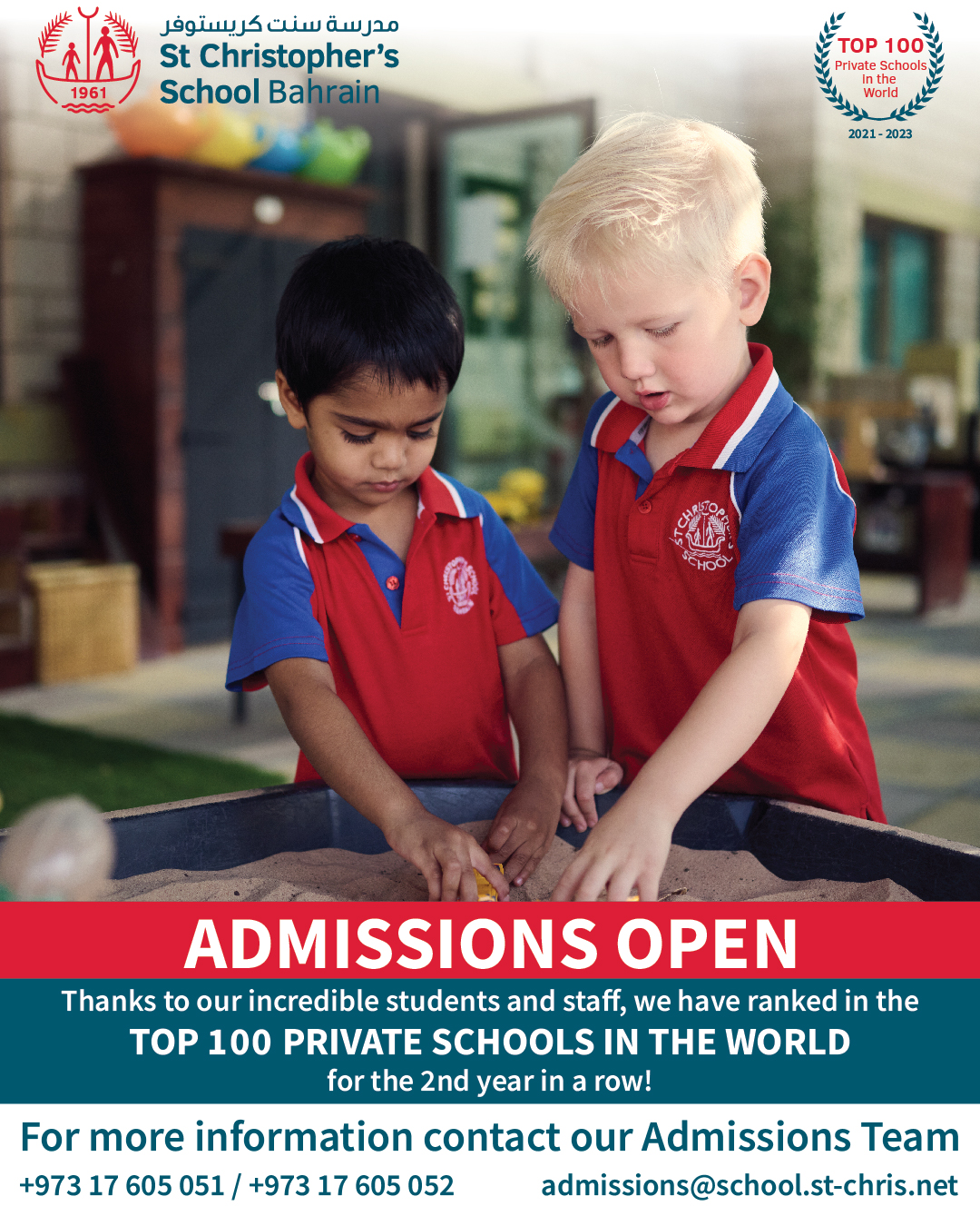 You can contact the St Christopher's School Admissions team by phone at +973 1760 5051 / +973 1760 5052 or by email at admissions@school.st-chris.net
