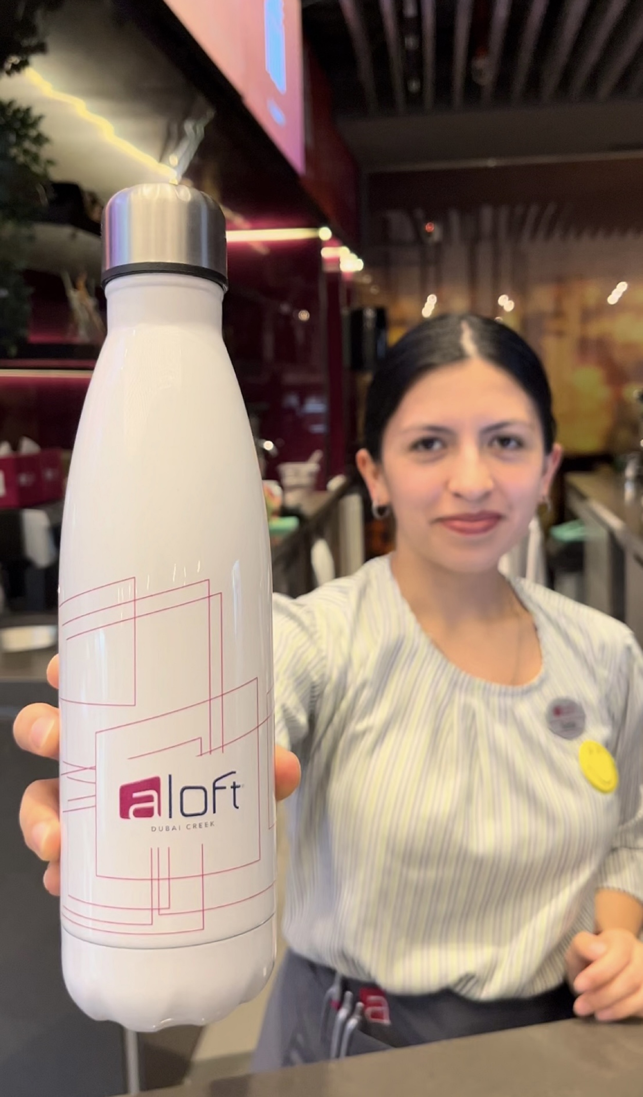 Aiming to eliminate plastic bottle consumption, they encourage guests and staff to use refillable water bottles by displaying an Aloft Dubai Can next to the dispenser.