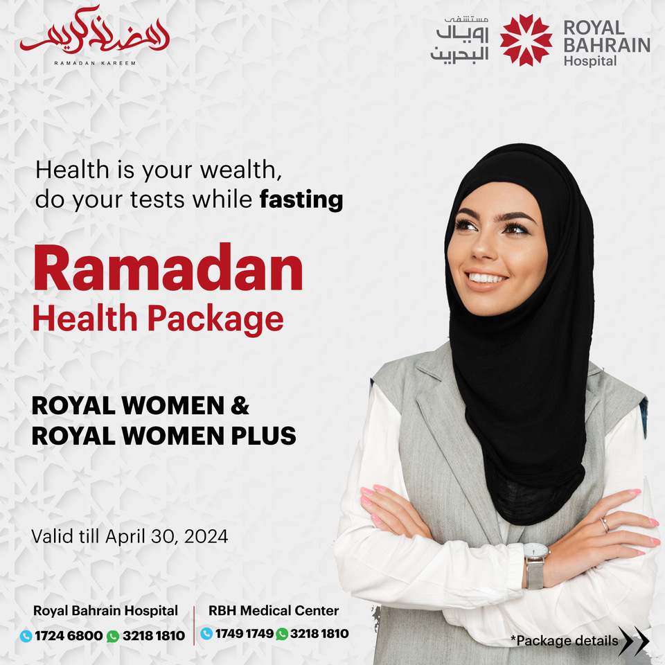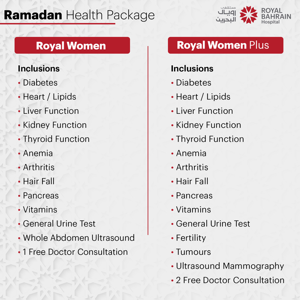 Call us at 1724 6800 to inquire about our Royal Women and Royal Women PLUS Ramadan Health Packages.