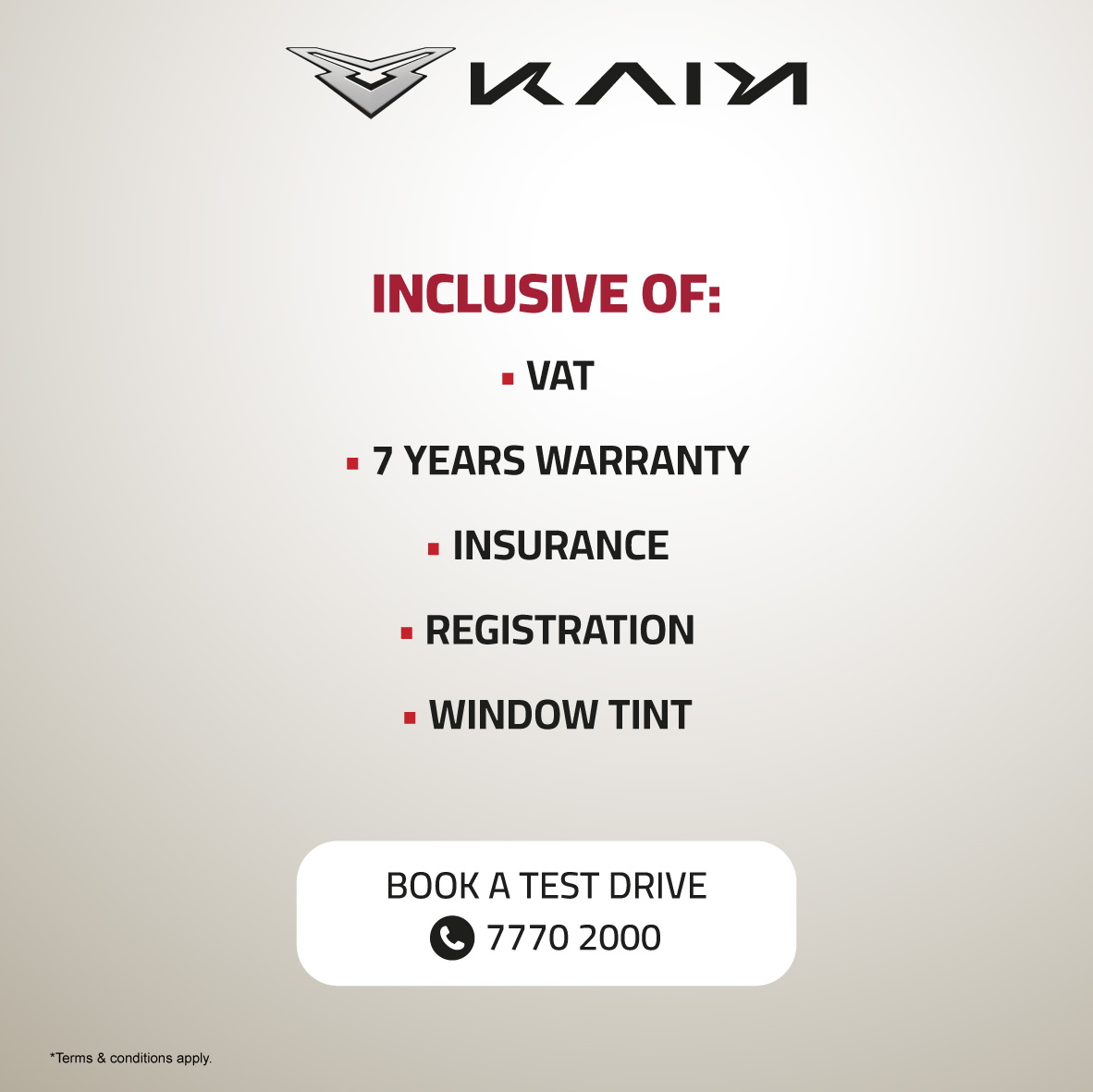 Offers are inclusive of VAT, 7 year warranty, Insurance, Registration, & Tinting.