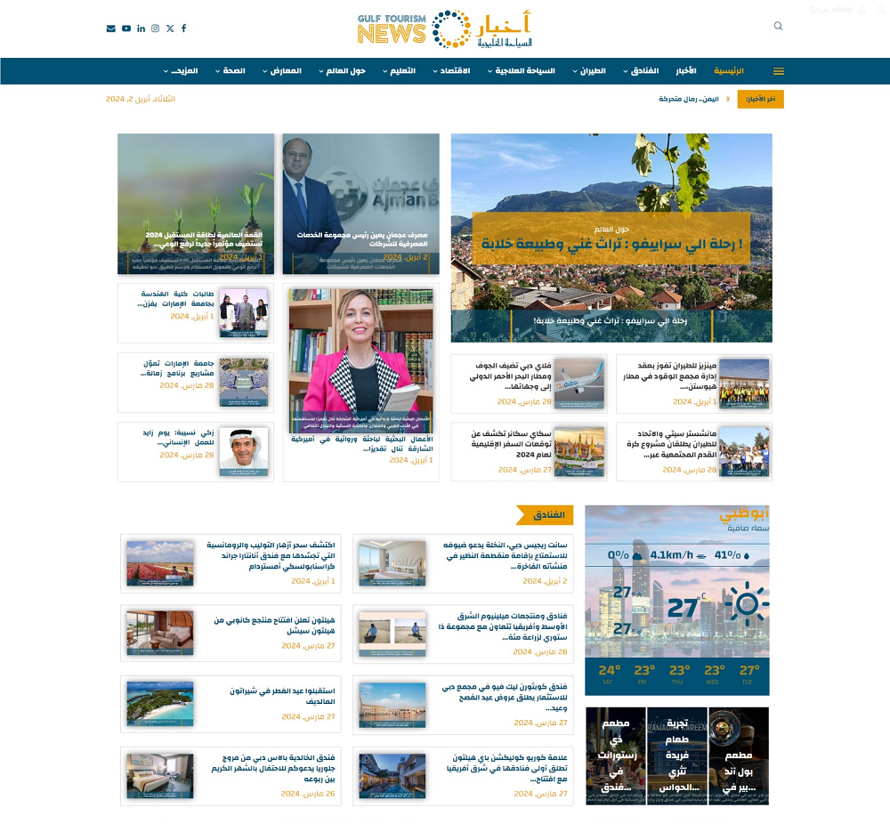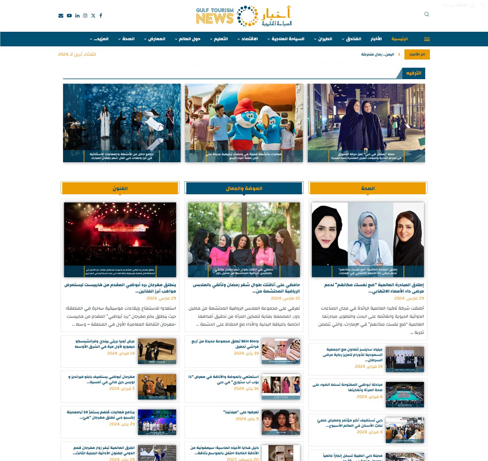 The news website, www.gulftourism.news, comprises various sections including hotels, aviation, economy, education, and world news, in addition to coverage of exhibitions and conferences, as well as health, medical tourism, and writers’ perspectives and articles.